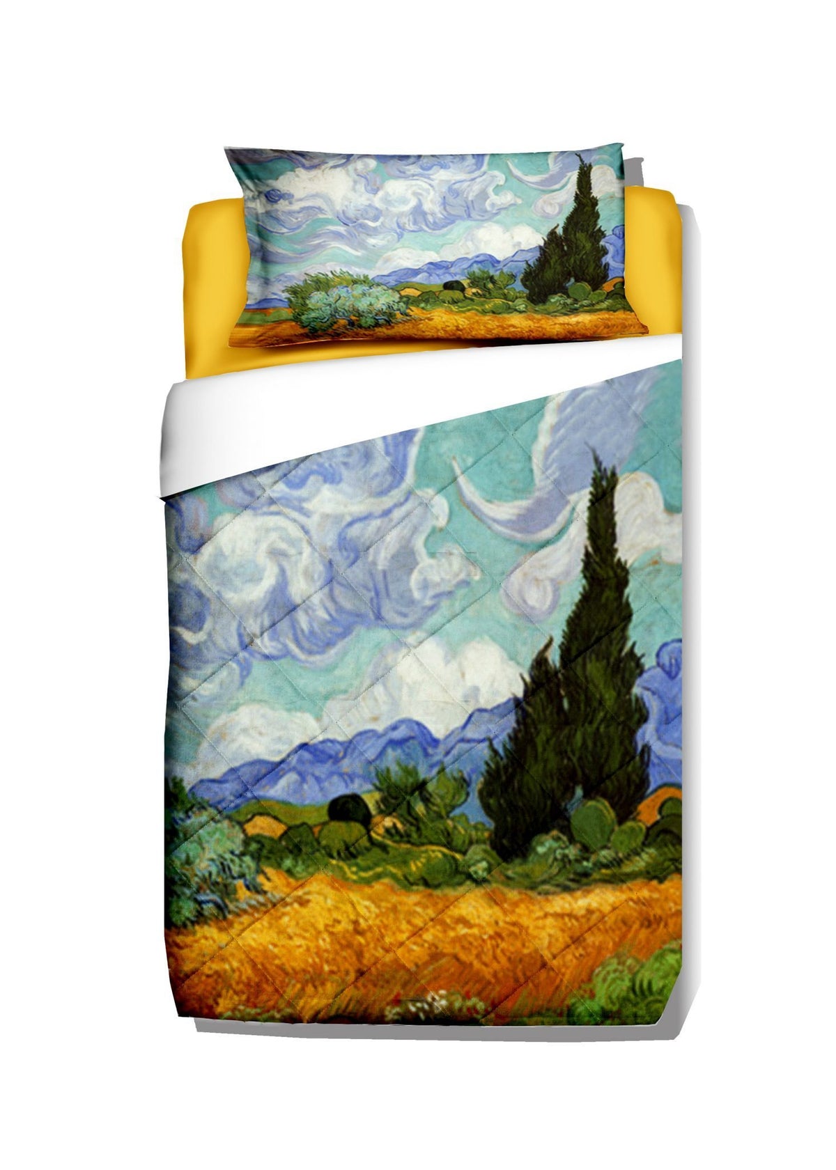 Our winter quilts are in high quality fabric, in soft 100% pure cotton digitally printed at very high resolution, which guarantees an excellent definition of the work of art / design and a perfect color resistance when washing. They consist of a double lining filled with soft hypoallergenic 100% polyester wadding of 300 grams / m2 (we do not use goose feathers because we are against animal exploitation). Each piece is characterized by quilting that pass it from side to side to perfectly fix the padding.
